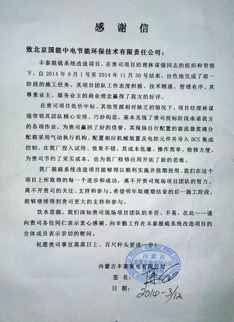 內(nèi)蒙古豐泰脫硫系統(tǒng)改造EPC項(xiàng)目受業(yè)主表揚(yáng)