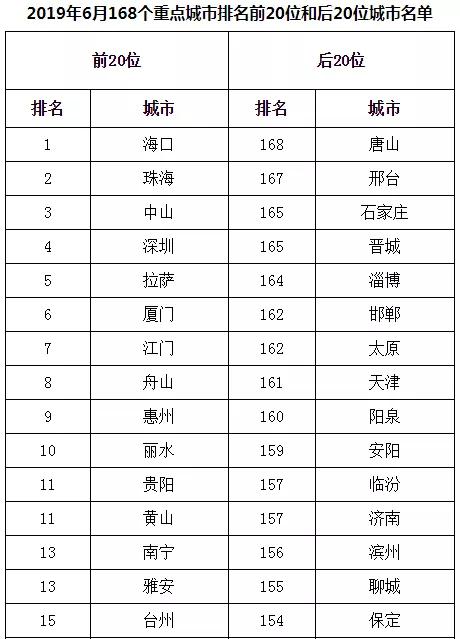 2019年6月,168個重點城市中唐山、邢臺、石家莊市等20個城市空氣質量相對較差(從第168名到第149名);???、珠海、中山市等20個城市空氣質量相對較好(從第1名到第20名,見附表1)。
